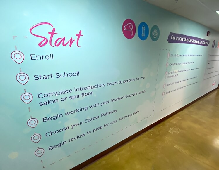 Wall murals and floor graphics applied with vinyl. This method has the advantage to look just like a painted mural, canvas print, photograph or other decorative options. Very versatile. Similar to a car wrap, but for floors and/or walls. Typically printed on a heavy duty vinyl film and coated with a heavy-duty lamination for protection and longevity.