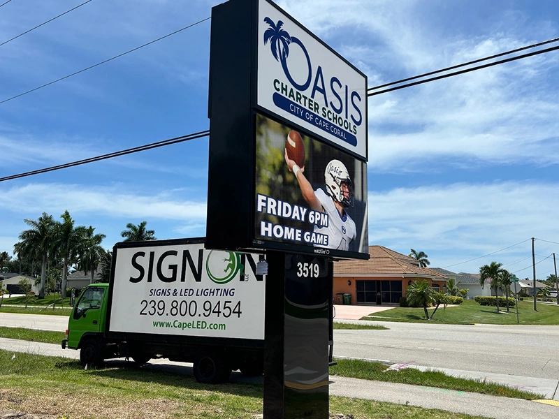 At Sign-On LLC in Cape Coral, FL,We specialize in designing and manufacturing high-quality outdoor signage tailored to meet your business needs. Our custom solutions include EMC digital signage, digital billboards, mobile billboards, roadside signs, and LED digital displays—each designed to capture attention and drive foot traffic. Whether you’re a small local business or a large corporation, our outdoor signs are built to make a strong and lasting impression.